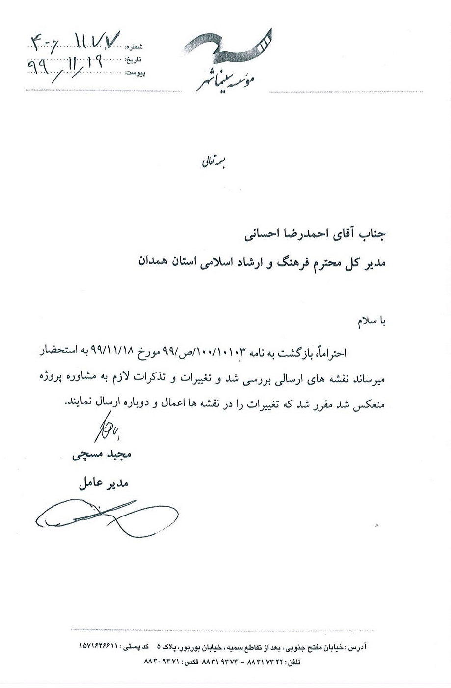 • منظمة السينما، وزارة الثقافة والإرشاد الإسلامي، شارع صافي علي شاه، شارع كمال ملك، ساحة بهارستان، طهران الرمز البريدي: 1516259852
