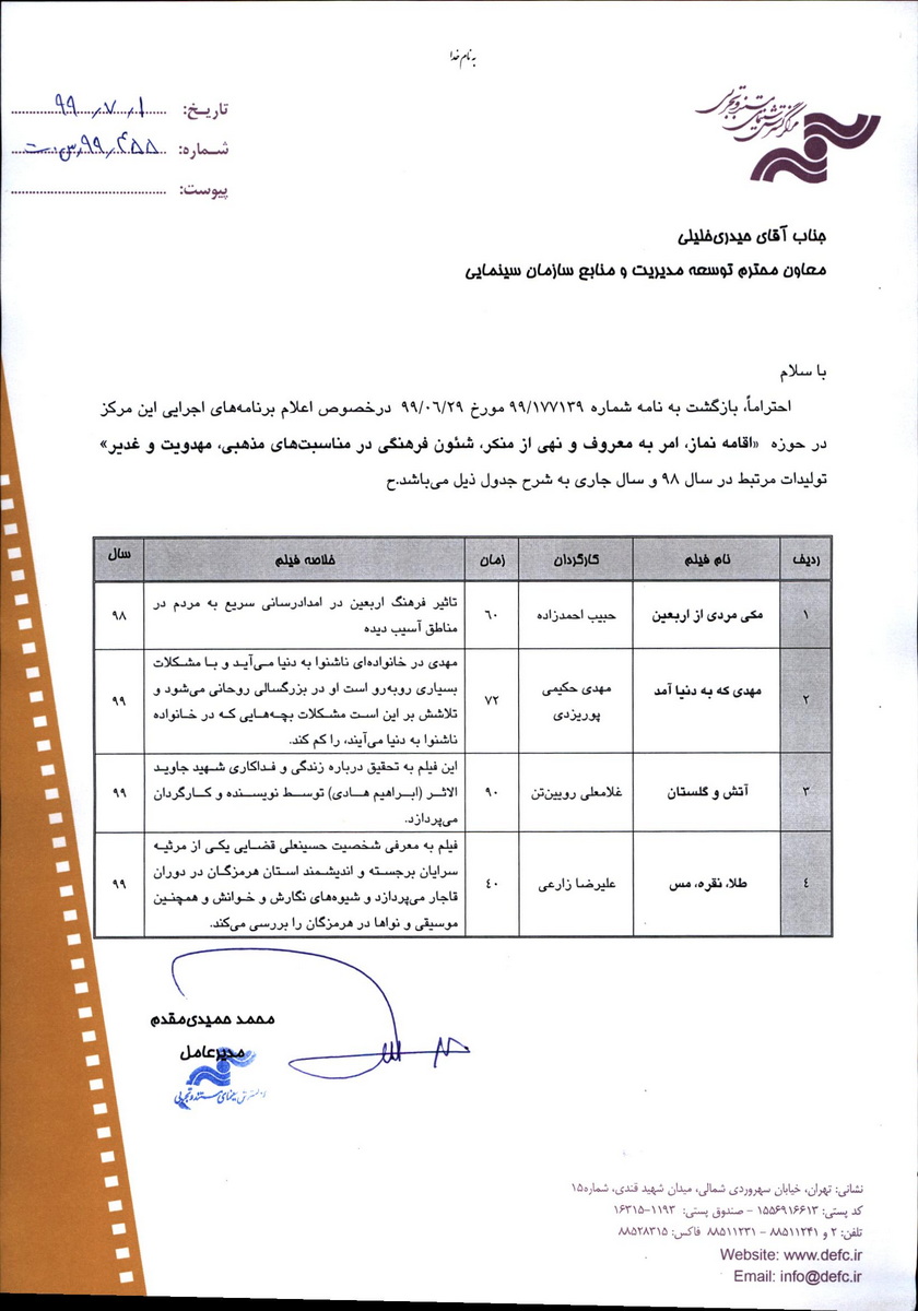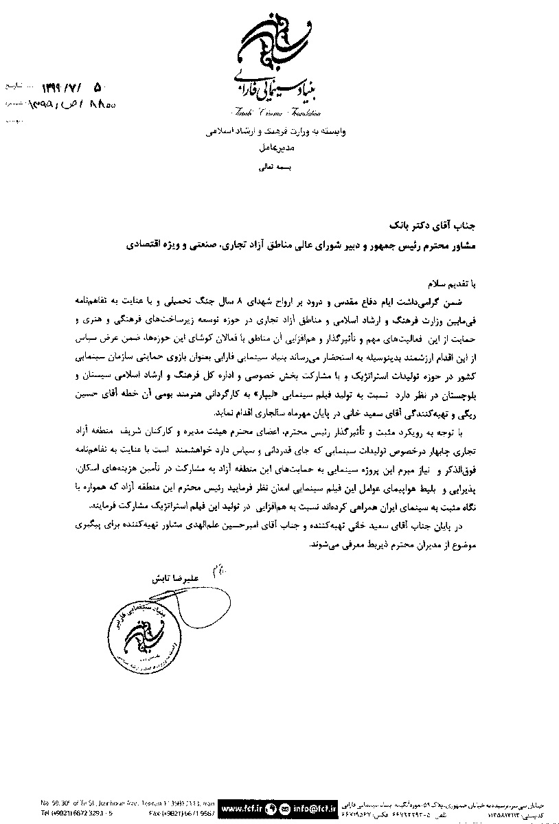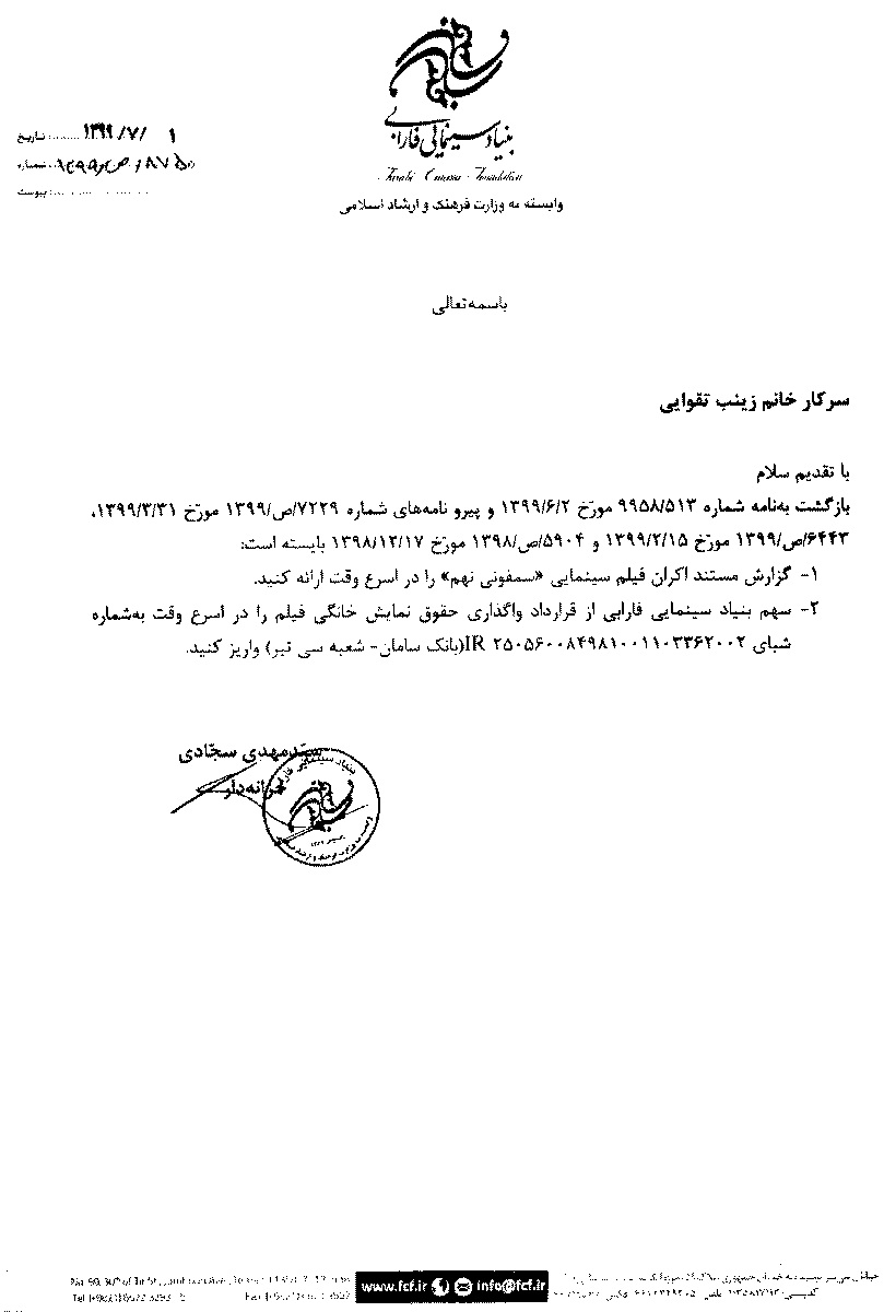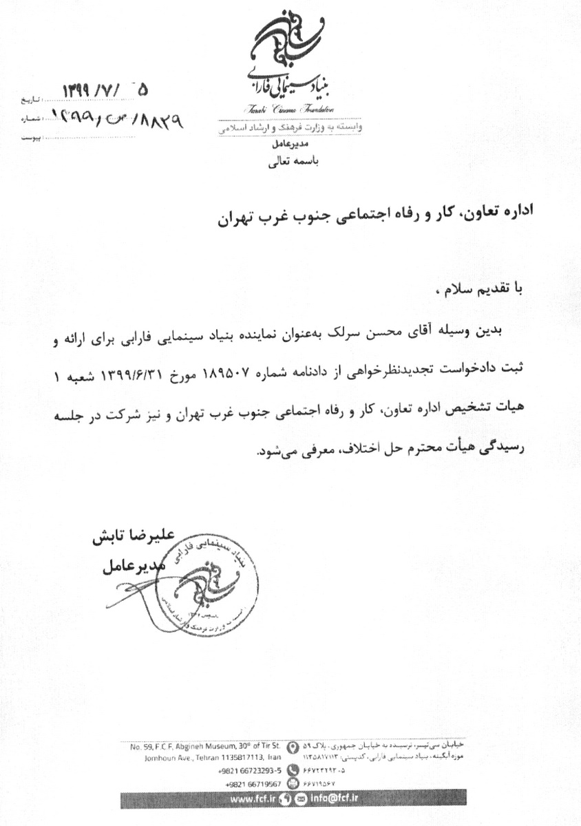 • منظمة السينما، وزارة الثقافة والإرشاد الإسلامي، شارع صافي علي شاه، شارع كمال ملك، ساحة بهارستان، طهران الرمز البريدي: 1516259852