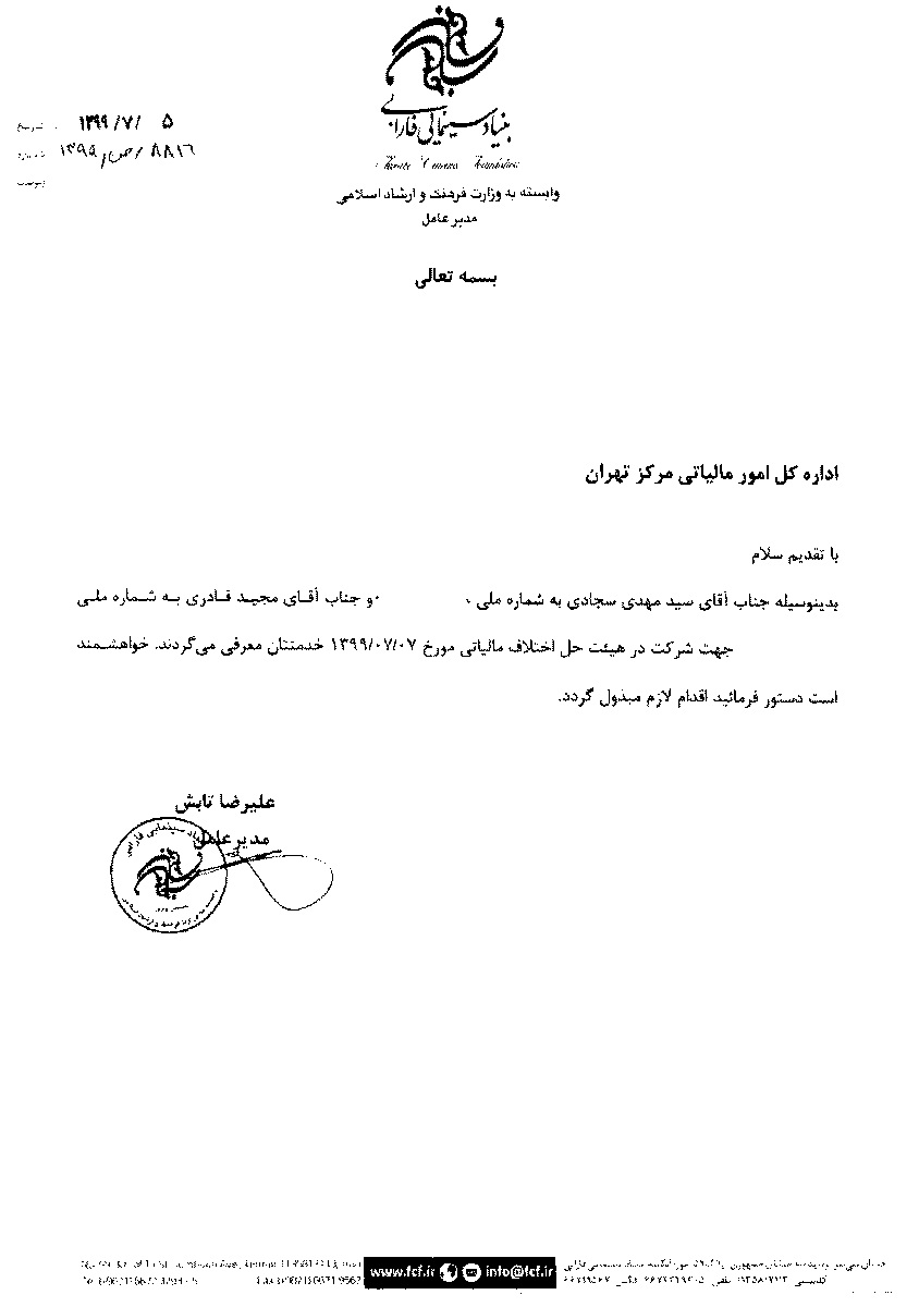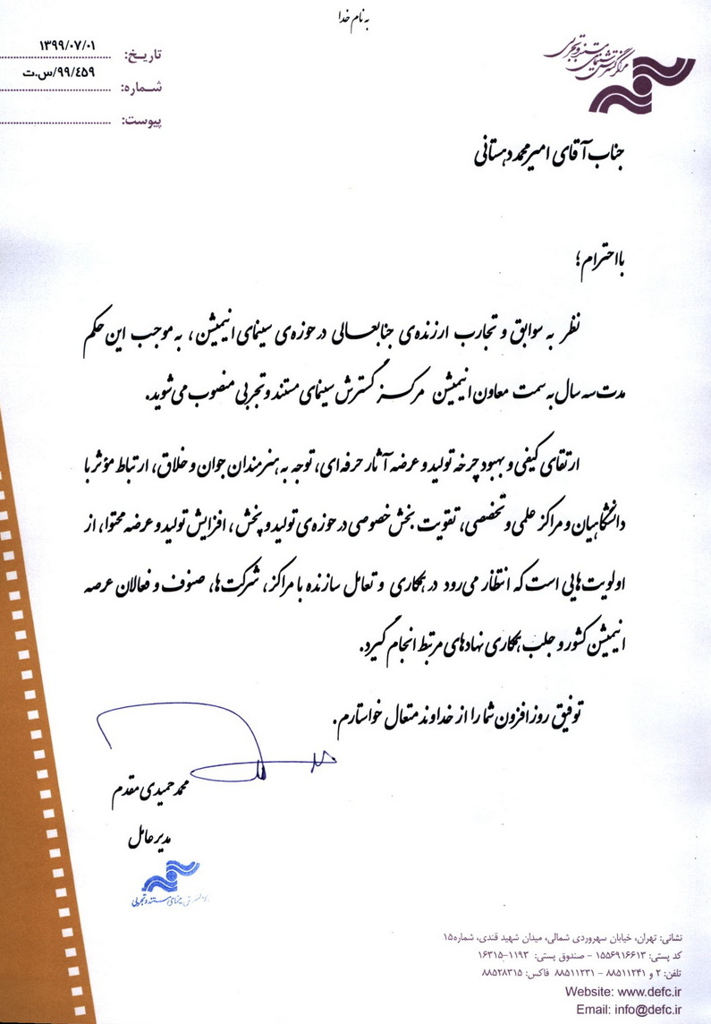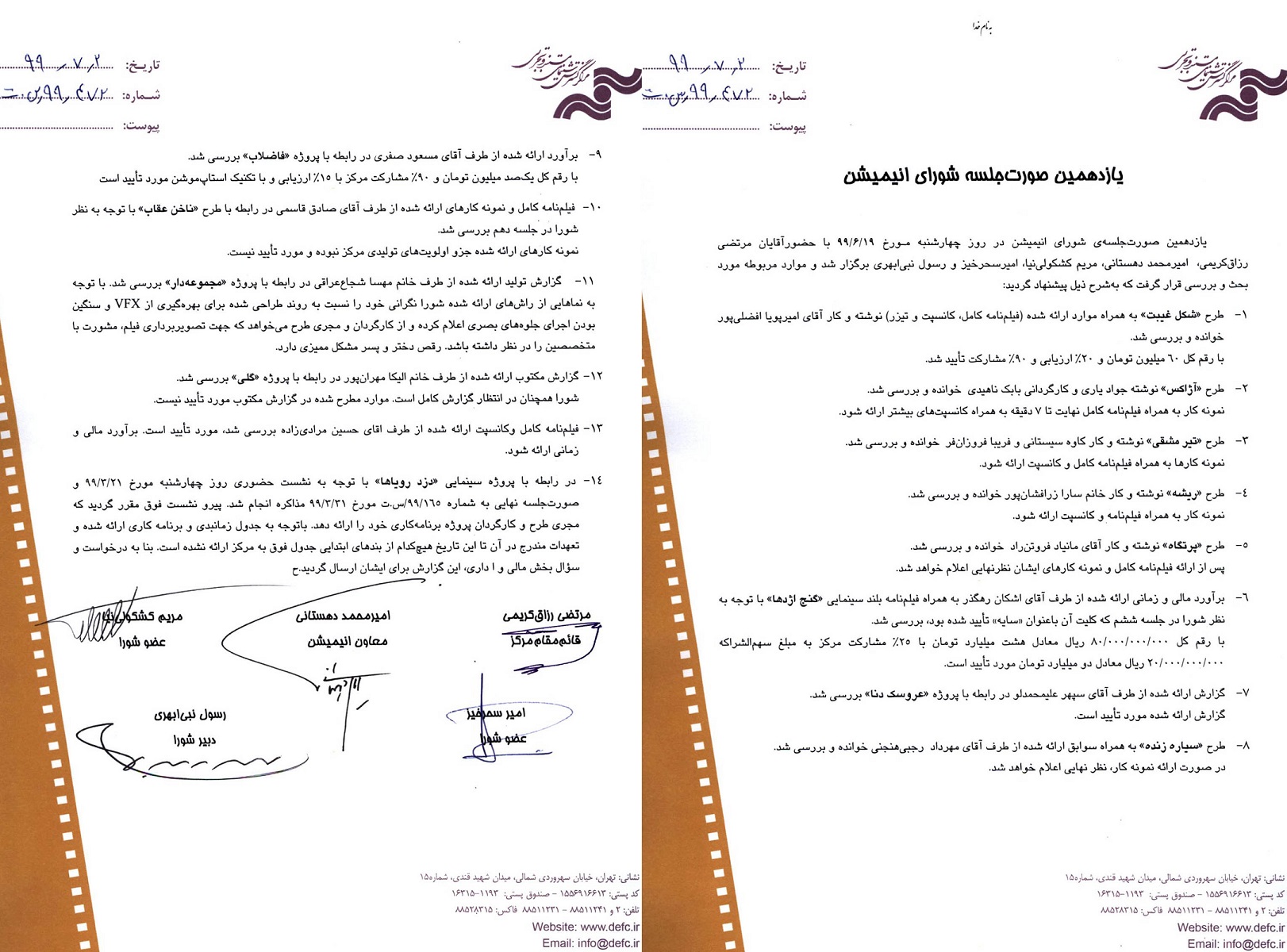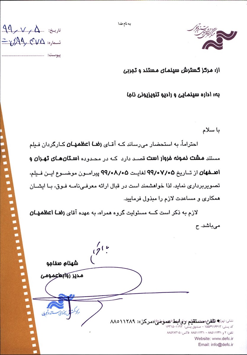 • منظمة السينما، وزارة الثقافة والإرشاد الإسلامي، شارع صافي علي شاه، شارع كمال ملك، ساحة بهارستان، طهران الرمز البريدي: 1516259852