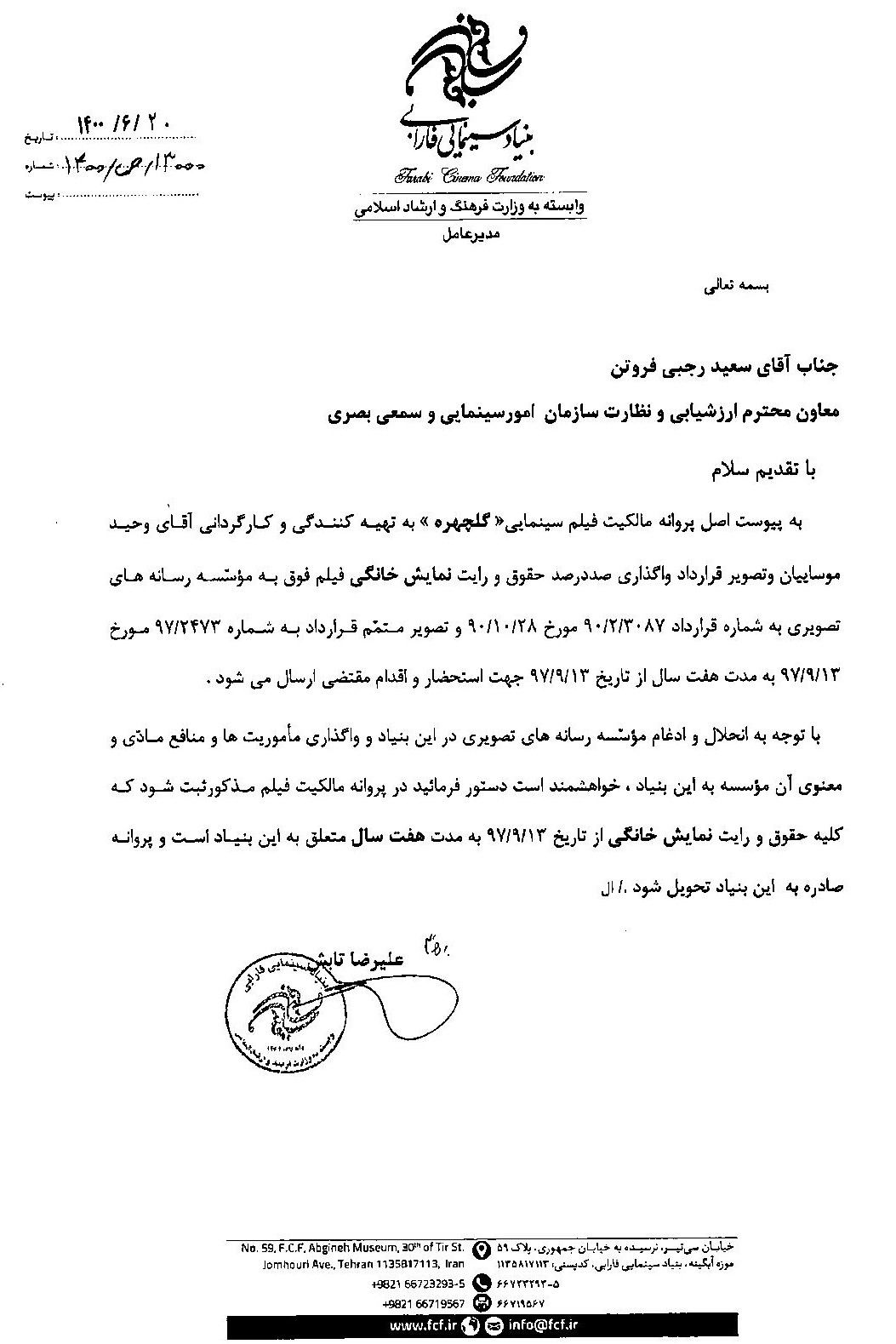 نمایش فایل اصلاح پروانه مالکیت فیلم سینمایی «گلچهره» دانلود فایل توضیح مختصر نام واحد / موسسه: بنیاد سینمایی فارابی سمت مقام امضا کننده: مدیرعامل مخاطب: معاون ارزشیابی و نظارت سازمان اشتراک گذاری در شبکه های اجتماعی تعداد بازدید: ۷۷۶ اطلاعات کلی فایل نوع فایل عکس حجم فایل ۲۴۰.۳ کیلوبایت عرض ۱,۰۵۳ پیکسل ارتفاع ۱,۵۷۹ پیکسل تاریخ عکاسی ۲۰ شهریور ۱۴۰۰ اظهار نظر میانگین امتیاز کاربران: 0.0 (0 رای) 12345 برای نظر دادن ابتدا باید به سیستم وارد شوید. برای ورود به سیستم روی کلید زیر کلیک کنید. ورود